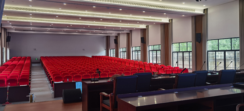 本項(xiàng)目報(bào)告廳采用2套SHOW L208雙8"無(wú)源線性陣列全頻箱+SHOW L18B超低線陣作為主擴(kuò)聲,人聲明亮層次豐富,低頻厚實(shí)有力,中頻圓潤(rùn)飽滿,高頻通透清晰;線性陣列全頻主擴(kuò)音箱吊掛安裝在舞臺(tái)兩側(cè),使視頻顯示時(shí)達(dá)到聲像一致的效果;周圍6只FLEX T12單12"專業(yè)音箱輔助音箱補(bǔ)聲,輔助音箱位于 ...