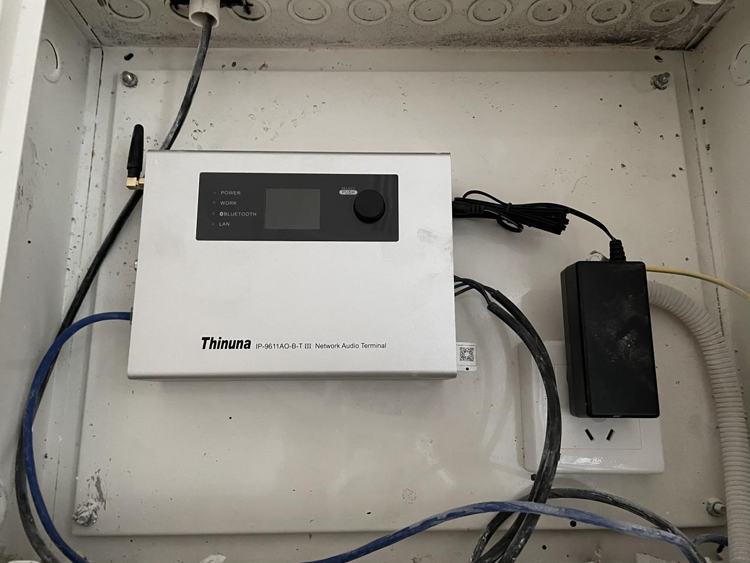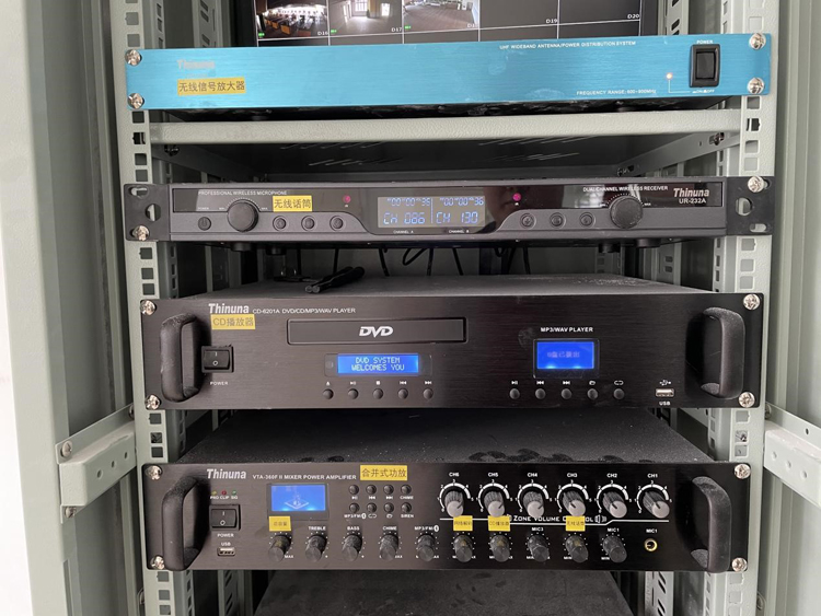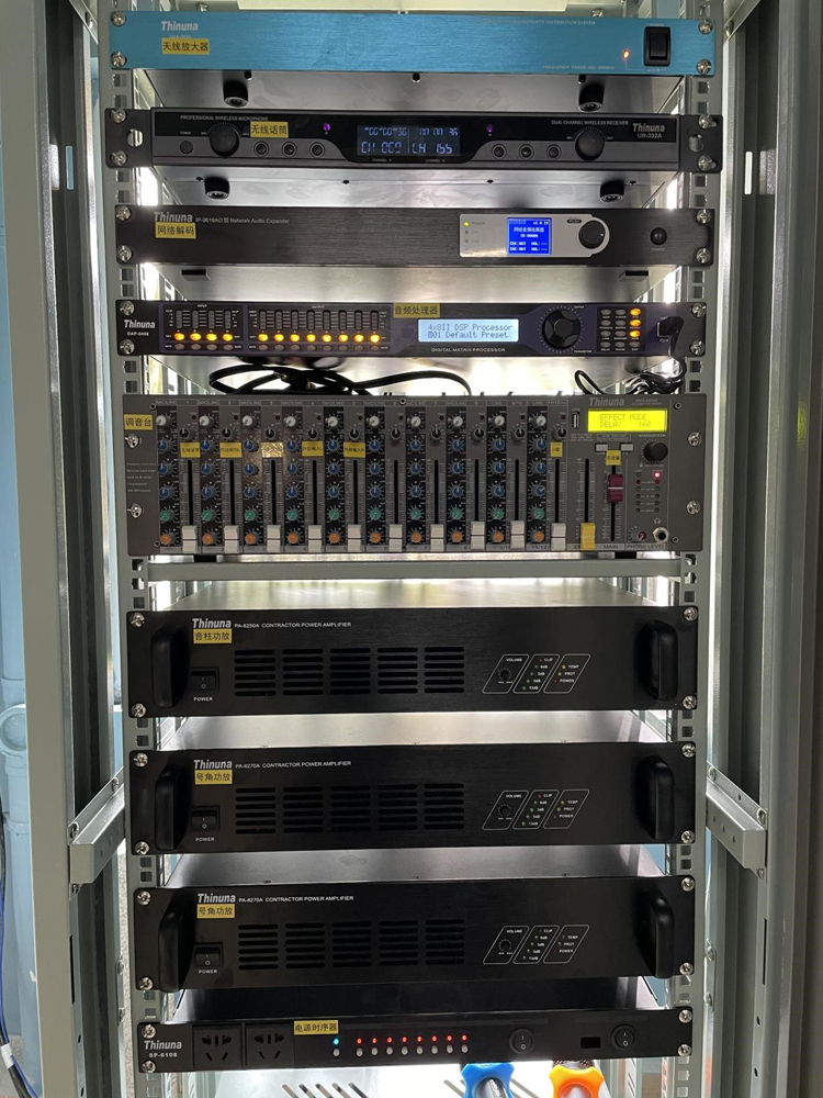 在游泳館和教學(xué)樓一樓架空層區(qū)域也有單獨(dú)進(jìn)行講話擴(kuò)聲授課的需求,也為此區(qū)域配置了一套獨(dú)立的講話擴(kuò)聲系統(tǒng),由Thinuna UDA-3000天線分配放大器和Thinuna UR-232A無線話筒組成;同時(shí)配置了Thinuna IP-9619AO III網(wǎng)絡(luò)音頻拓展器,可以將來自網(wǎng)絡(luò)的音頻信號(hào)進(jìn)行解碼播放;后端采用合并式功放+60W豪華防水音柱或20W壁掛喇叭的組合,達(dá)到經(jīng)濟(jì)性的同時(shí)也使此區(qū)域可以播放上下課鈴聲、背景音樂,也可以在此區(qū)域使用無線手持話筒進(jìn)行授課和講話等需求。