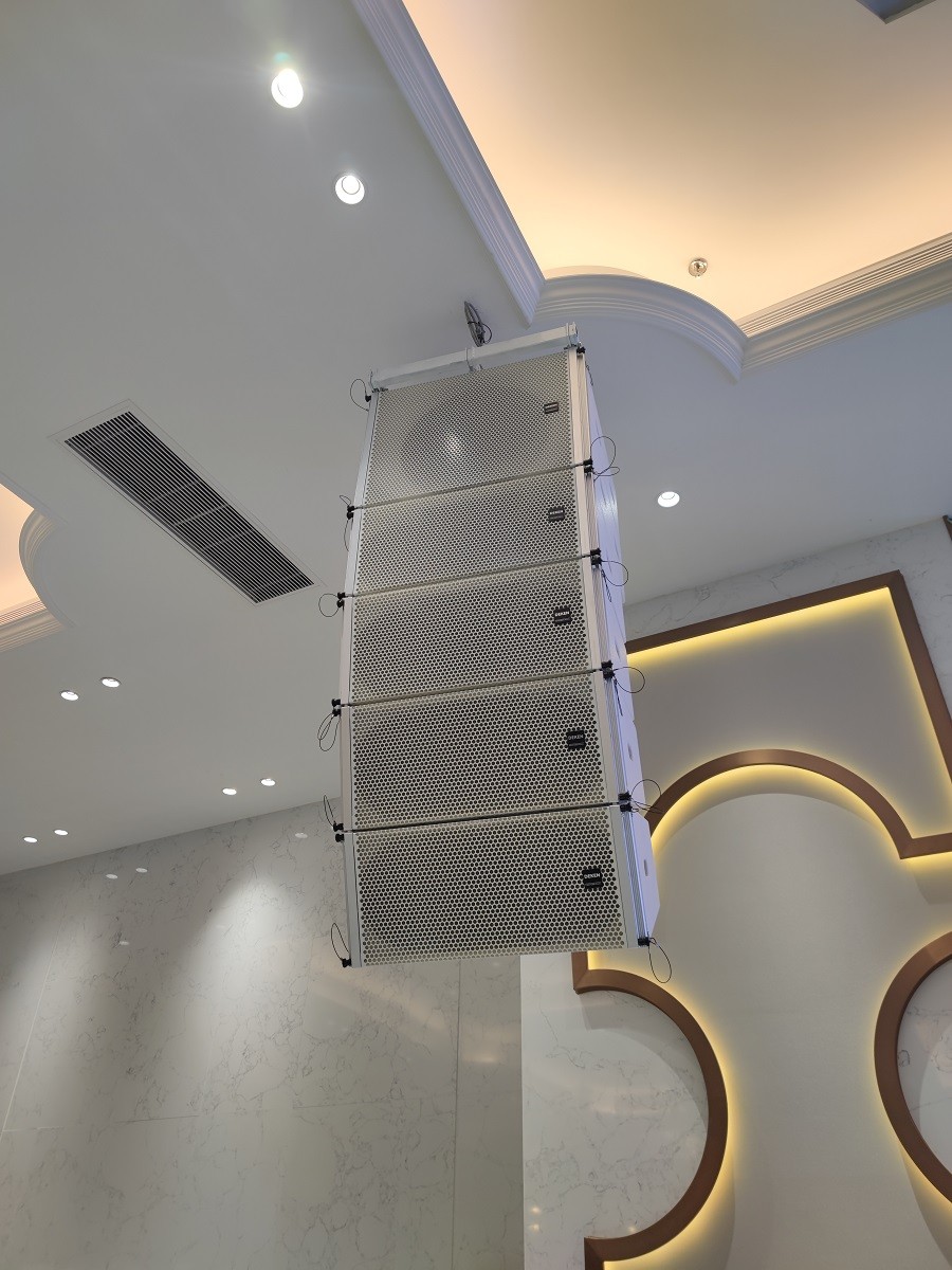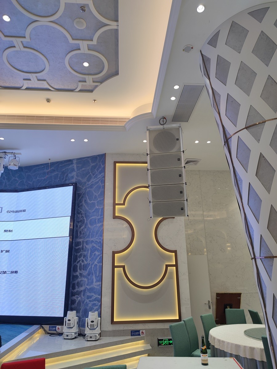 左右兩串線陣5只線陣音箱,在舞臺兩側(cè)上方,6只輔助音箱采用壁裝方式,壁掛在宴會廳兩邊,主要負(fù)責(zé)中前場區(qū)域的擴(kuò)聲。