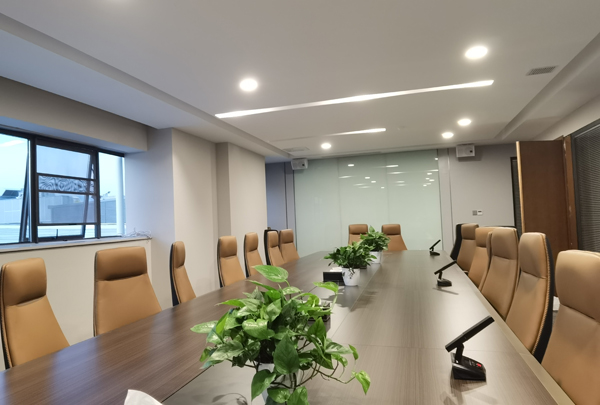 除了食堂的擴(kuò)聲系統(tǒng)外,阜陽天邦·拾分味道(臨泉)一期屠宰工廠園區(qū)的辦公樓的領(lǐng)導(dǎo)會(huì)議室的會(huì)議擴(kuò)聲同樣也采用DEKEN的專業(yè)會(huì)議音頻系統(tǒng),擴(kuò)聲揚(yáng)聲器選用4只6寸全頻音箱FLEX T6,搭配8路調(diào)音臺(tái)MX-F8跟二進(jìn)四出數(shù)字音頻處理器DAP-0204 II等周邊設(shè)備組成的小型擴(kuò)聲系統(tǒng)。為了避免由于設(shè)備布線而破壞原裝飾的問題,會(huì)議室的拾音發(fā)言設(shè)備采納了Thinuna的VA-8000系列無線會(huì)議系統(tǒng),VA-8000系列是UHF頻段的無線會(huì)議系統(tǒng),全數(shù)字控制,采用FM調(diào)頻實(shí)現(xiàn)聲音信號(hào)傳輸,發(fā)言單元帶有獨(dú)有的新型防嘯叫單指向高靈敏度電容咪芯,完美壓制了會(huì)議現(xiàn)場多話筒發(fā)言配合環(huán)境反射造成的聲反饋現(xiàn)象。