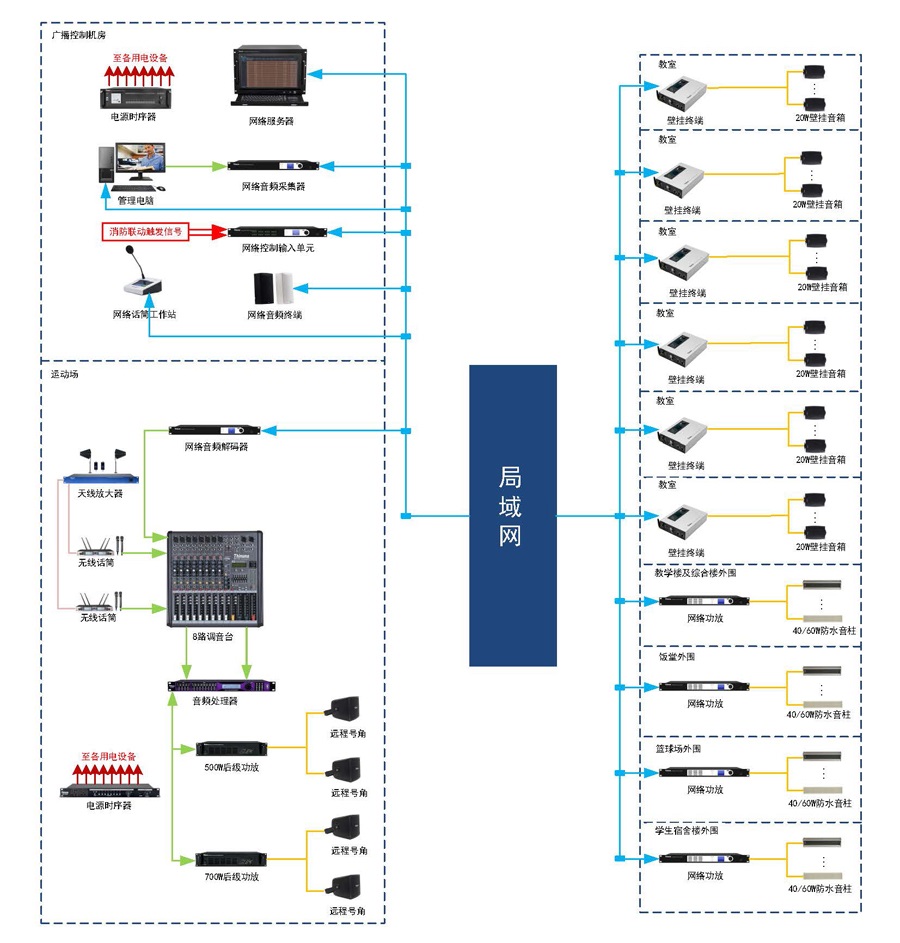 4、運動場廣播:學(xué)生活動的主要場所,實現(xiàn)早操升旗和運動會的廣播需求,在操場分控室可以通過無線話筒實現(xiàn)領(lǐng)導(dǎo)本地發(fā)言,也可以采用電腦以及U盤等外置音源本地音源播放運動會、跑操、升旗等活動相關(guān)的歌曲信號,同時還可以遠(yuǎn)程接收網(wǎng)絡(luò)遠(yuǎn)程話筒工作站的尋呼信號和廣播控制室的音頻信號,滿足運動場等區(qū)域舉行各種活動的功能使用。