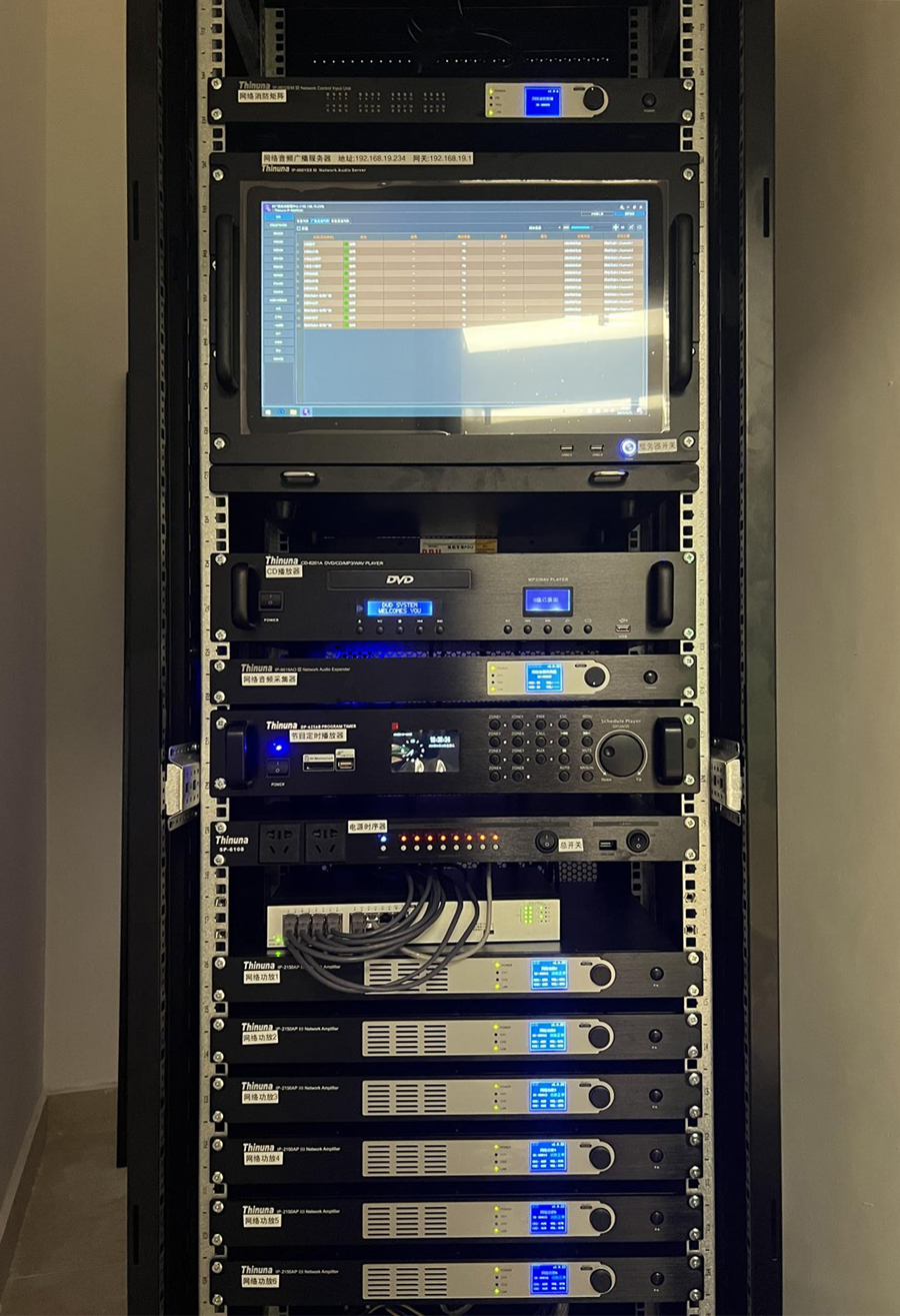首先,我們?cè)O(shè)計(jì)團(tuán)隊(duì)了解營(yíng)銷中心的實(shí)際布局,根據(jù)布局特點(diǎn)及人員流動(dòng)情況,設(shè)計(jì)出一個(gè)覆蓋廣泛的廣播布點(diǎn)布局,以保證音樂、通知公告和廣告的播放效果質(zhì)量。為保證音頻等多媒體信號(hào)的快速傳輸和傳輸范圍的效果質(zhì)量,本次項(xiàng)目廣播系統(tǒng)設(shè)計(jì)選用網(wǎng)絡(luò)IP媒體作傳輸架構(gòu)的Thinuna IP-9600 III 系列全新一代網(wǎng)絡(luò)廣播系統(tǒng)。