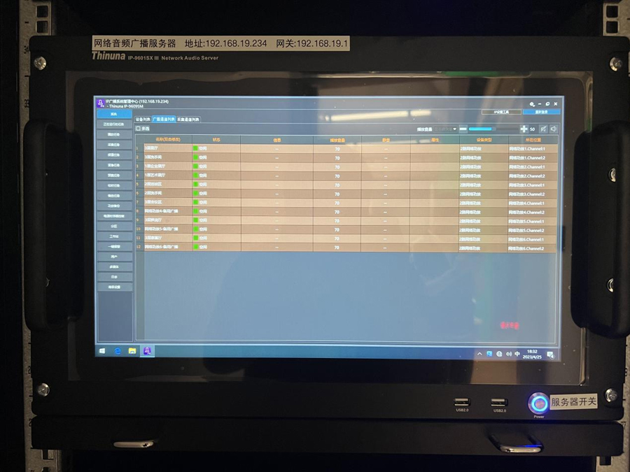 在營(yíng)銷中心廣播機(jī)房?jī)?nèi)放置了IP網(wǎng)絡(luò)廣播系統(tǒng)的核心設(shè)備:網(wǎng)絡(luò)廣播服務(wù)器IP-9601SX III。該廣播系統(tǒng)核心設(shè)備內(nèi)置安裝了網(wǎng)絡(luò)廣播管理中心IP-9609SM III,具備多種廣播任務(wù)管理方案,包括定時(shí)廣播任務(wù)、即時(shí)廣播任務(wù)、頻道廣播任務(wù)、采集觸發(fā)廣播任務(wù)、緊急觸發(fā)廣播任務(wù)、預(yù)案任務(wù)、終端點(diǎn)播任務(wù)、人工語音任務(wù)和插播任務(wù)等;多種廣播任務(wù)管理方案可以按全天24小時(shí)、按星期每周的方式進(jìn)行編排營(yíng)銷中心所需的廣告、音樂、通知公告的自動(dòng)播放,每個(gè)區(qū)音量自由調(diào)節(jié),實(shí)現(xiàn)無人值守系統(tǒng)自動(dòng)運(yùn)行。亦可在網(wǎng)絡(luò)廣播管理中心IP-9609SM III可對(duì)營(yíng)銷中心按樓層、不同的使用區(qū)域等廣播通道進(jìn)行分區(qū)操作。實(shí)現(xiàn)了分區(qū)廣播的需求。