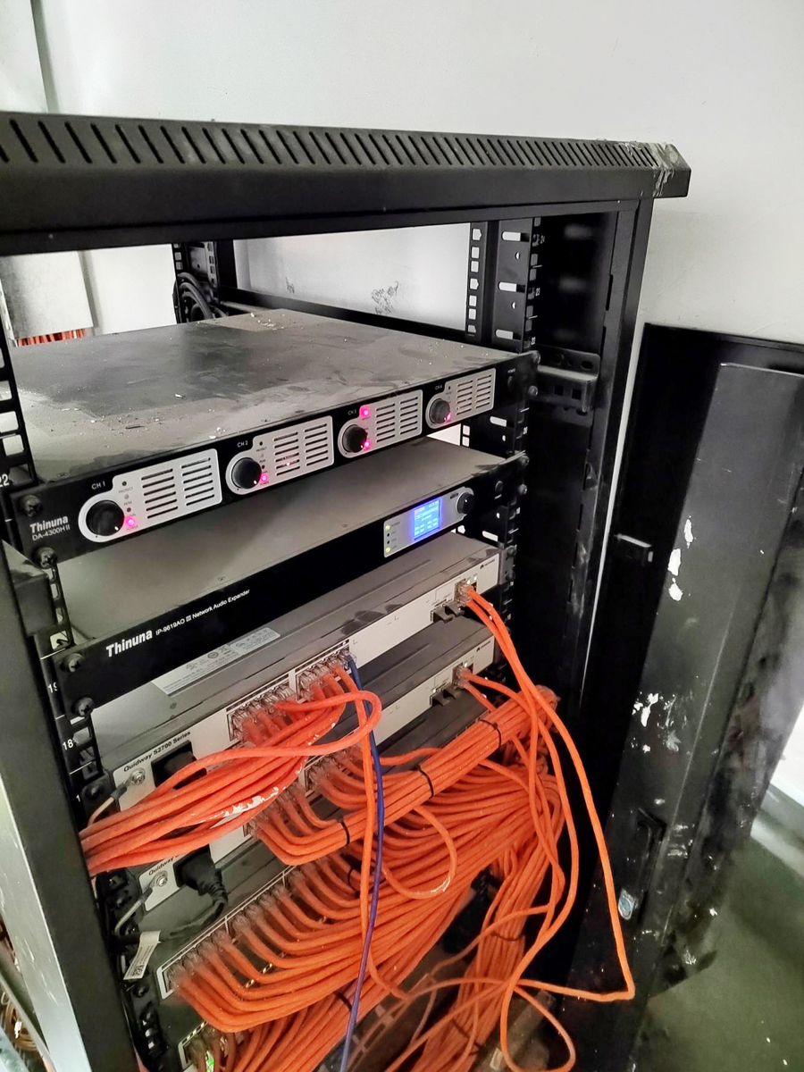 在走廊/室外活動區(qū)等場所配置了IP-9619AO III 網(wǎng)絡(luò)音頻拓展器與Thinuna DA-4600H 四通道模塊化定壓數(shù)字功放,用來把來自網(wǎng)絡(luò)音源或本地音源的弱信號放大,推動音箱放聲,19英寸標(biāo)準(zhǔn)機(jī)架式、1U高度,任何有以太網(wǎng)口的地方均可接入,自帶單口集線器(HUB),可接受服務(wù)器及其它IP網(wǎng)絡(luò)設(shè)備的訪問與控制。網(wǎng)絡(luò)故障自我診斷,網(wǎng)絡(luò)及服務(wù)狀態(tài)顯示;可兼容SIP協(xié)議,Onvif協(xié)議。具有兩路線路輸入/輸出,線路方向可以通過軟件來配置,線路接口處帶方向指示;可將網(wǎng)絡(luò)上數(shù)字音頻信號轉(zhuǎn)換為模擬音頻信號,帶有雙聲道RCA輸出和混合聲音鳳凰端子平衡輸出;輸出可接數(shù)字功放、可連接普通傳統(tǒng)模擬功放,也可通過雙聲道RCA作為音源輸出;可將模擬音頻信號轉(zhuǎn)換成為數(shù)字信號傳給網(wǎng)絡(luò),帶有雙聲道采集功能;強(qiáng)切功能,當(dāng)有消防信號啟動時(shí)會自動輸出24V電信號和三線制強(qiáng)切電信號打開音量控制器,無需再外加設(shè)備;特有的功放檢測功能,網(wǎng)絡(luò)可實(shí)時(shí)監(jiān)控功放狀態(tài);帶DC24V備用電源接口;帶功放備份功能,系統(tǒng)可實(shí)現(xiàn)1備多自動切換;工作信號燈指示,本地音量控制,彩色顯示屏;可以本地配置網(wǎng)絡(luò)參數(shù)。