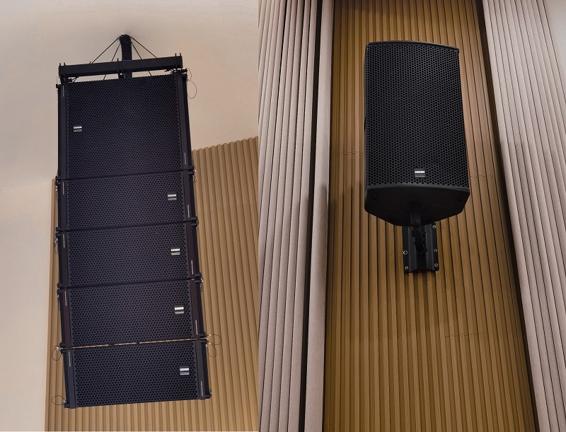 本項目報告廳采用2套SHOW L208雙8"無源線性陣列全頻箱+SHOW L18B超低線陣作為主擴聲,人聲明亮層次豐富,低頻厚實有力,中頻圓潤飽滿,高頻通透清晰;線性陣列全頻主擴音箱吊掛安裝在舞臺兩側,使視頻顯示時達到聲像一致的效果;周圍6只FLEX T12單12"專業(yè)音箱輔助音箱補聲,輔助音箱位于報告廳中后方,使報告廳內(nèi)聲壓級均勻;2只FLEX T18S 18"超低頻音箱,增強頻響范圍,讓舞臺效果更加震撼;在舞臺前沿配置了2只STAGE M12返聽音箱、2只FLEX T12臺唇音箱,讓舞臺表演人員與前排觀眾區(qū)域的聲壓級一致,讓舞臺的發(fā)言人、觀眾同時聽到清晰飽滿的聲音。