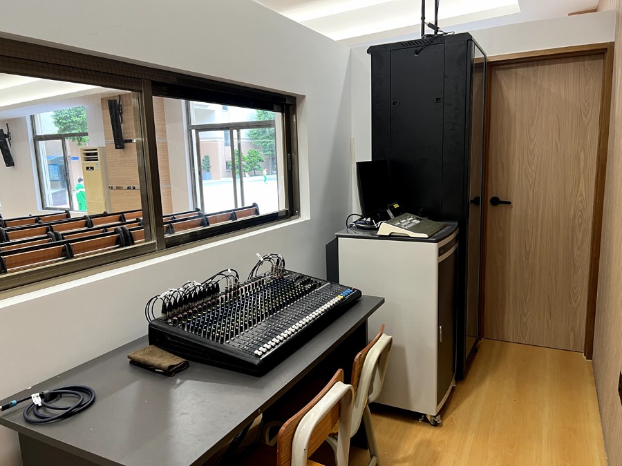 本項目多功能階梯教室采用2套SHOW Q30 12*2.25"線性陣列音柱+SHOW Q212S 2*12”重低音音箱作為主擴聲,人聲明亮層次豐富,低頻厚實有力,中頻圓潤飽滿,高頻通透清晰;線性陣列音柱主擴音箱壁掛安裝在左右兩個LED大屏兩側(cè),使視頻顯示時達到聲像一致的效果;兩側(cè)采用4只SHOW Q20 8*2.25"線性陣列音柱作補聲,輔助補聲線性陣列音柱位于多功能階梯教室兩側(cè)中后方,使多功能階梯教室內(nèi)聲壓級均勻;在前方教學(xué)講臺區(qū)域前沿上方配置了2只FLEX T26雙6.5”無源內(nèi)置多功能兩分頻音箱作返聽音箱,讓在教師授課、校方會議領(lǐng)導(dǎo)講話和學(xué)生上臺發(fā)言時與前排觀眾區(qū)域的聲壓級一致,讓校方教學(xué)講臺區(qū)域的發(fā)言人、觀眾同時聽到清晰飽滿的聲音。