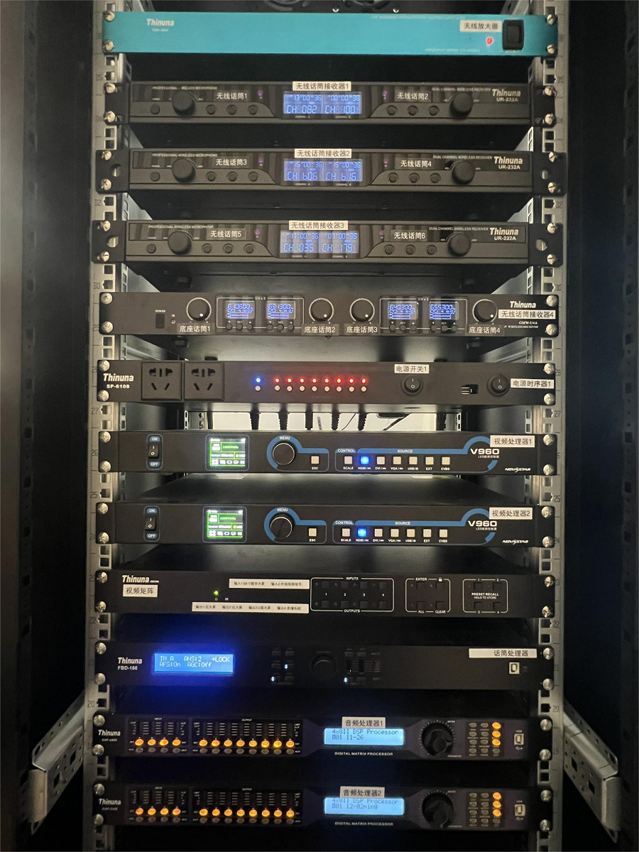 1、專業(yè)擴聲系統(tǒng):本項目多功能階梯教室拾音部分的配置方面,搭配UR-232A無線手持話筒、無線頭戴話筒和GMW-U4A一拖四無線會議鵝頸話筒,其特點是靈敏度高,具備出色的抗干擾能力,優(yōu)秀的中高頻響應(yīng),聲音溫暖、飽滿,有效防止串頻及嘯叫,并配置UDA-3000天線放大器,無線使用距離可達100米。音頻型號處理部分配置24路四編組調(diào)音臺MX-G24,編組調(diào)音臺的多路編組輸出,可分出音源實時供給全高清精品課程自動錄播系統(tǒng)、錄音機、刻錄機等設(shè)備,實現(xiàn)了音源分類,有效的阻斷回聲。音頻信號處理部分設(shè)備則配置兩臺4進8出音頻處理器DAP-0408和一臺智能語音增強處理器FBD-166,主要作用于對語言講話噪音的抑制、反饋信號的抑制、聲音音質(zhì)的處理美化、延時處理等等功能;在后期的調(diào)試過程中,可以根據(jù)各個音箱不同的優(yōu)化,進行單獨對單個區(qū)域的音箱效果進行處理,確保校方進行各類日常教學(xué)授課、學(xué)術(shù)報告演講、大型教學(xué)研討活動時可提供更清晰、更真實的優(yōu)質(zhì)音效傳輸及控制,并增強設(shè)備整體抗干擾能力,減少無用雜音、信號對各類教學(xué)活動的干擾,使得多功能階梯教室聲壓覆蓋均勻,語言自然,還原度高。保證教室內(nèi)各個角落都能清晰地傳遞老師的聲音,確保每個學(xué)生都能聽到清晰的講解。