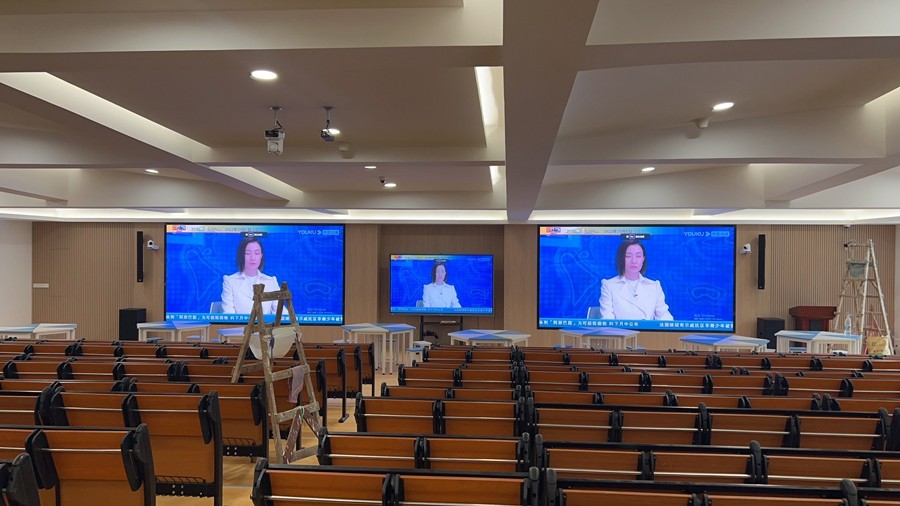 3、LED大屏顯示系統(tǒng):在多功能階梯教室前方左右兩側(cè)位置設(shè)置2個顯示尺寸為3.84*2.08m像素間距:1.86mm的LED大屏,在多功能階梯教室前方中間位置設(shè)置98寸教學(xué)一體機,用于播放授課教學(xué)PPT以及教學(xué)視頻等內(nèi)容。通過配置HDMI矩陣切換器HDMI-0404進行4進4出的無縫4Kx2K@60Hz信號切換傳輸,滿足校方對多功能階梯教室不同的顯示需求,實現(xiàn)對LED大屏的遠程管理和控制,方便校方播放各類日常教學(xué)授課、學(xué)術(shù)報告演講、大型教學(xué)研討的顯示內(nèi)容。