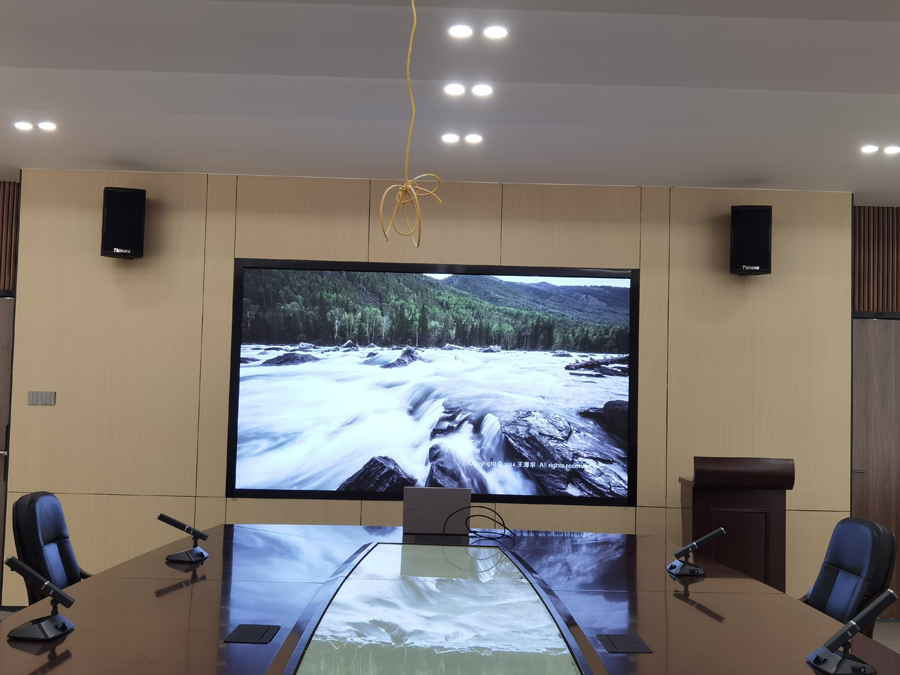 走進(jìn)會議室,首先映入眼簾的就是6m2的高清全彩LED大屏,作為多媒體會議系統(tǒng)的顯示端,為了保證LED顯示系統(tǒng)設(shè)備的穩(wěn)定性,工程設(shè)計師選擇了國內(nèi)外著名企業(yè)龍健集團(tuán)旗下LED屏幕設(shè)備生產(chǎn)板塊的子公司龍建光電公司的LED高清顯示屏,同時為了保證屏幕畫面的清晰度和色彩的飽和度,還特地采用了P1.53小間距的屏幕模組。之所以在眾多的顯示終端設(shè)備中選擇全彩小間距LED屏幕,是因為全彩小間距LED屏幕具備以下的特點: