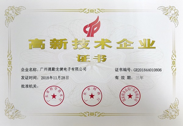 根據(jù)國家《高新技術(shù)企業(yè)認定管理辦法》和《高新技術(shù)企業(yè)認定管理工作指引》的相關(guān)規(guī)定,廣州德勤龍健電子有限公司(以下簡稱“德勤龍健”)獲得由廣東省科學(xué)技術(shù)廳、廣州省財政廳、國家稅務(wù)總局廣東省稅務(wù)局聯(lián)合批準頒布的高新技術(shù)企業(yè)證書。標志著德勤龍健正式邁入國家重點支持的高新技術(shù)企業(yè)的行列中。