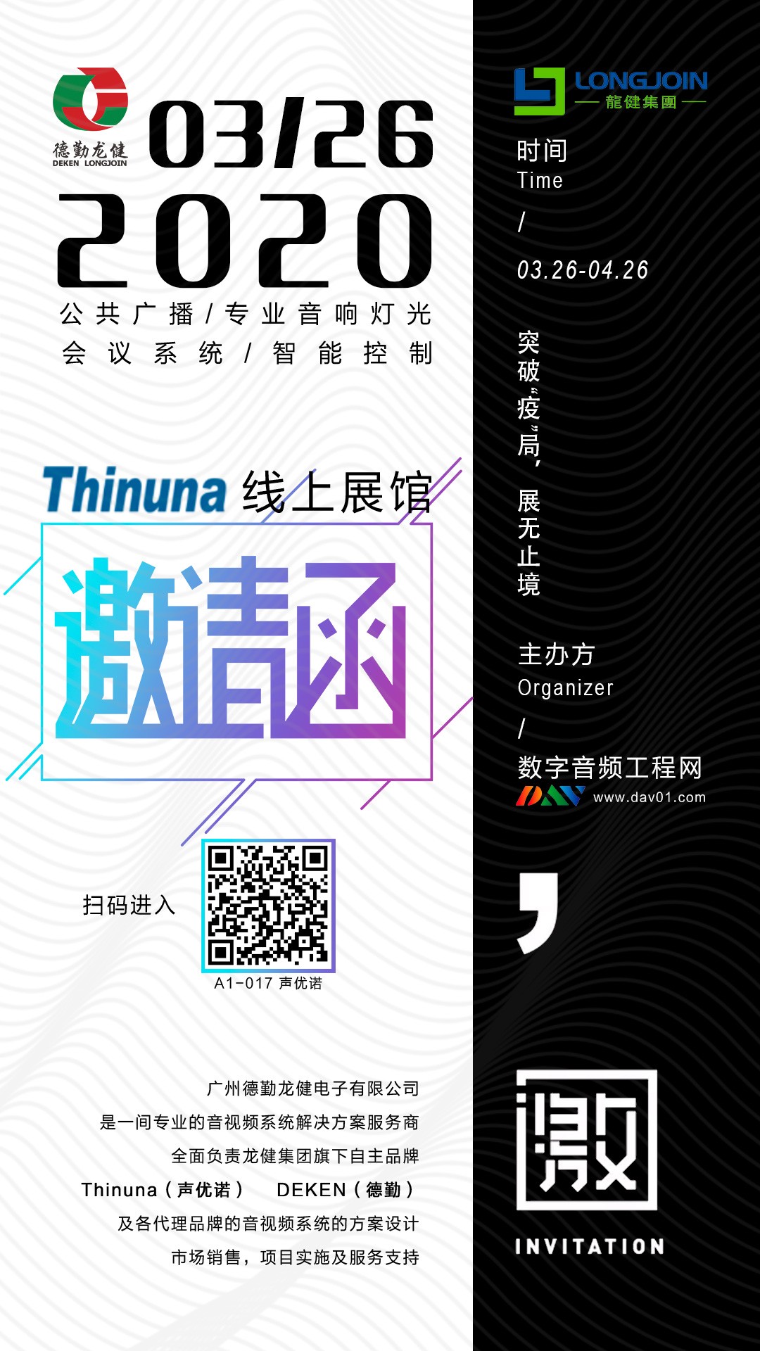 展會將于2020年3月26-4月26日 在數(shù)字音視工程網(wǎng) 舉辦,Thinuna(聲優(yōu)諾)展位位于"會議音響燈光館 ",掃描下方二維碼即可直達Thinuna(聲優(yōu)諾)”A1-017 “展位,我們期待您的蒞臨!