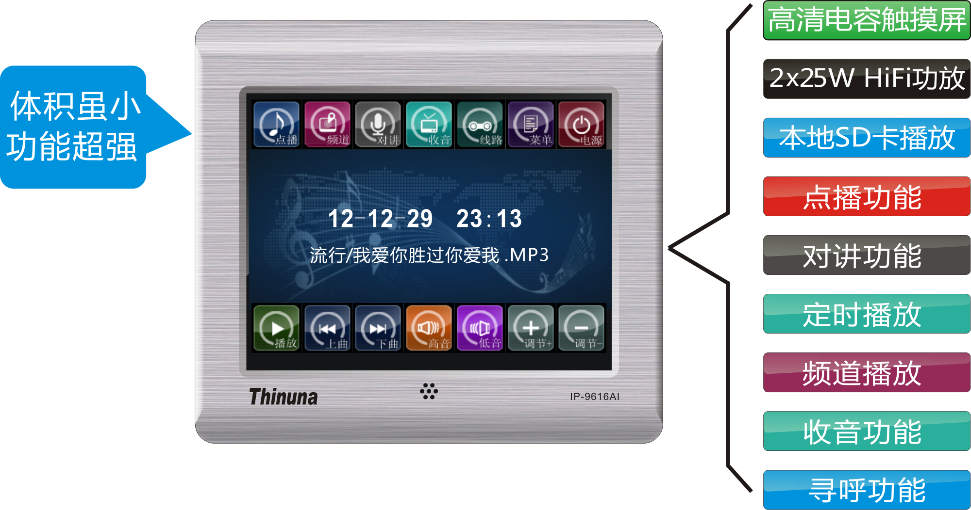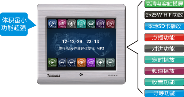 功放集成在終端面板上,2*25W HIFI 立體聲功放。