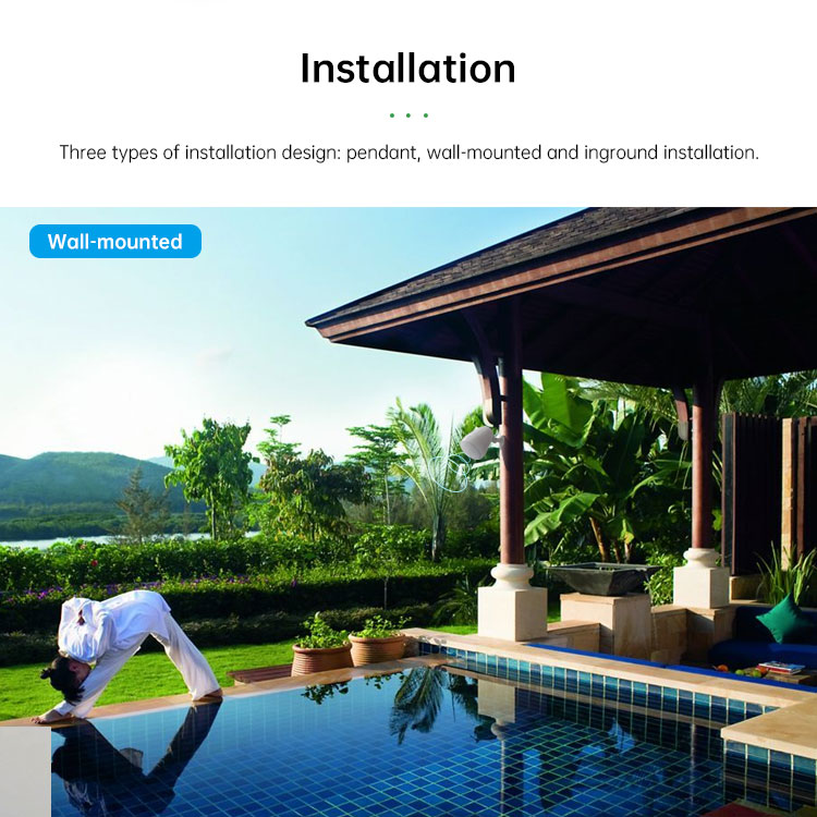 安裝方式::三種安裝方式:吊掛(附帶鋼絲安裝繩),壁掛(附帶安裝壁架)、可埋地隱藏式(附帶安裝底盤)