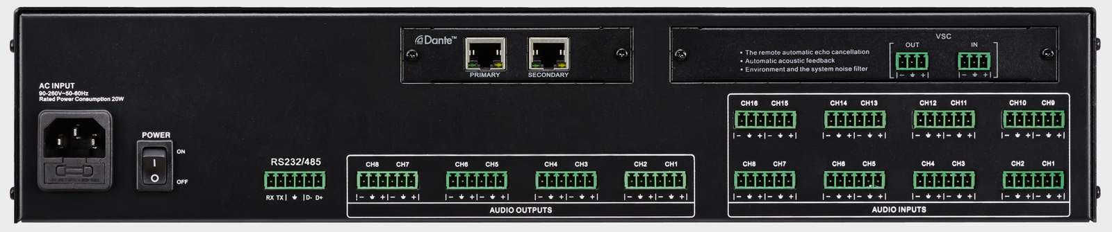 功能強(qiáng)大的AUX通道具有PEQ均衡處理、壓縮器/限幅功能,自動(dòng)混音處理功能:混音的閥值、幅度、啟動(dòng)時(shí)間、恢復(fù)時(shí)間等參數(shù)連續(xù)可調(diào)。以及自動(dòng)攝像跟蹤觸發(fā)功能:觸發(fā)的閥值、幅度、啟動(dòng)時(shí)間、恢復(fù)時(shí)間等參數(shù)連續(xù)可調(diào)。同時(shí)具有AEC自動(dòng)回聲消除和背景降噪功能,其可有效降低在遠(yuǎn)程會(huì)議環(huán)境中由于話筒的二次拾音產(chǎn)生的聲學(xué)回聲問題,同時(shí)還可以有效消除現(xiàn)場話筒的反饋以及空調(diào)、風(fēng)扇等有的環(huán)境噪聲。可保證在任何環(huán)境中都可以實(shí)現(xiàn)無噪音、高清晰的現(xiàn)場音頻會(huì)議及遠(yuǎn)程視頻會(huì)議。