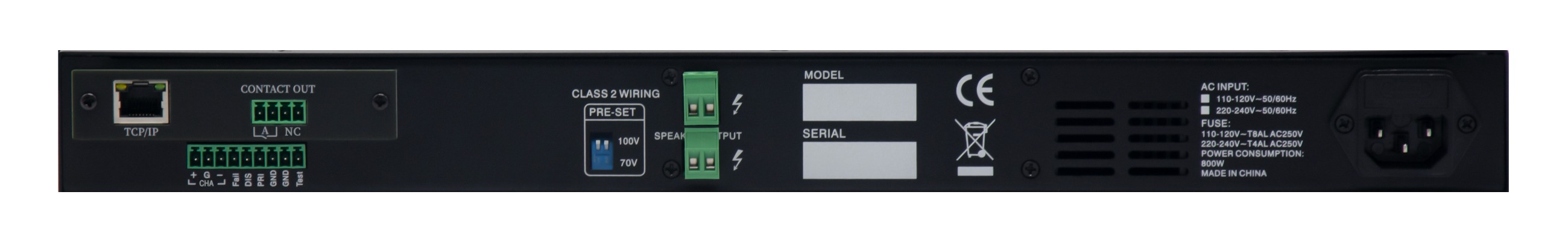 數(shù)字功放適用于兩種70 / 100V線路安裝(通過撥碼開關(guān)可選)