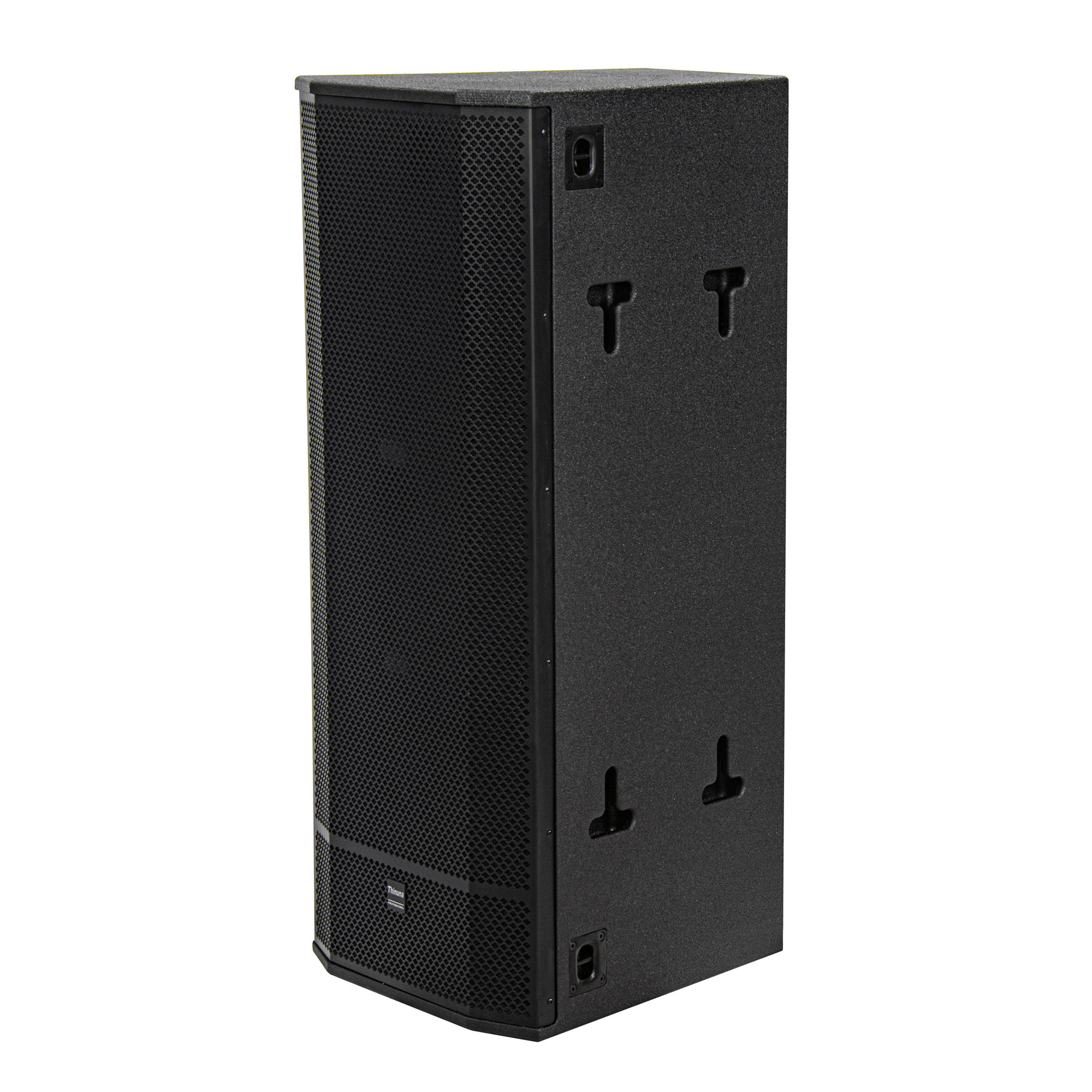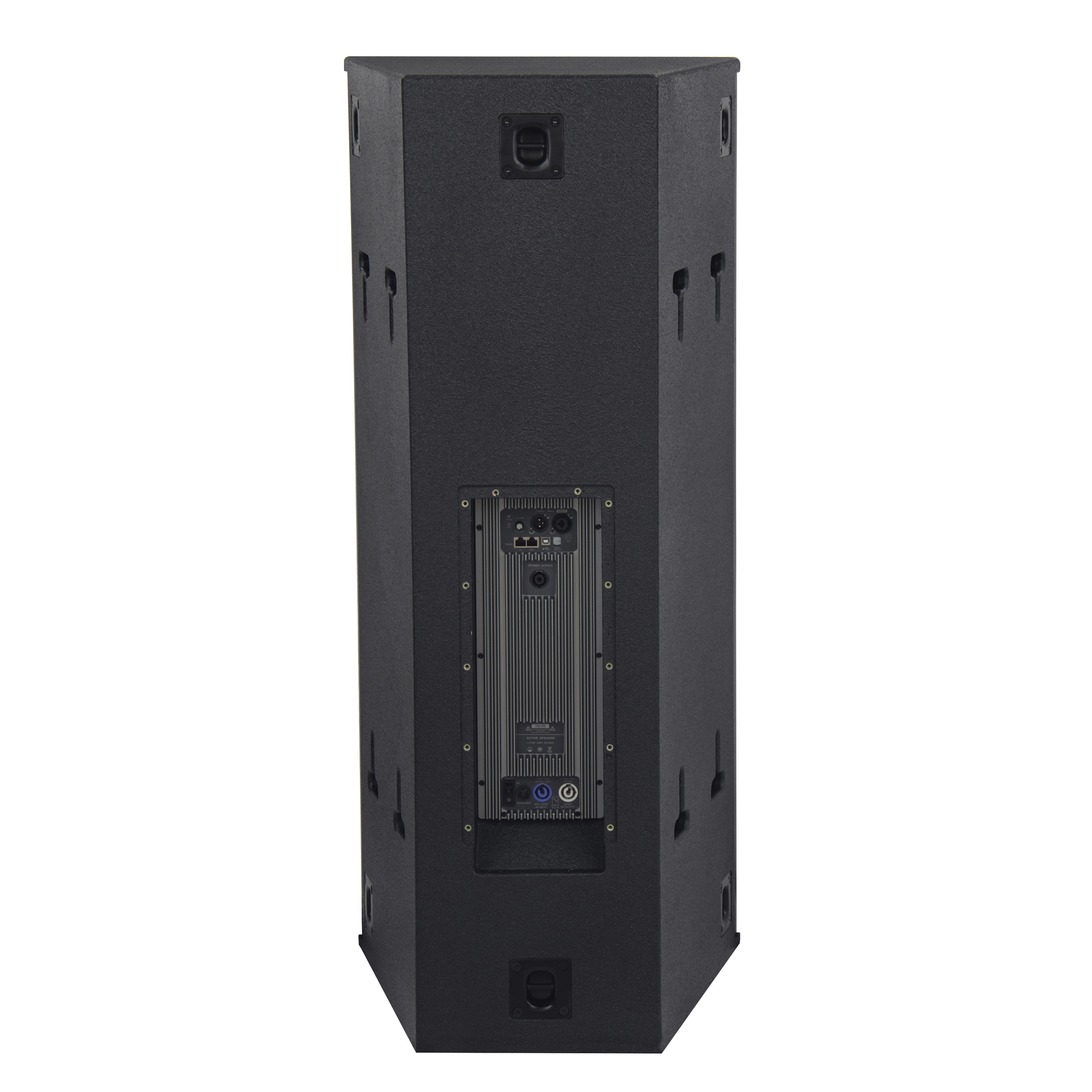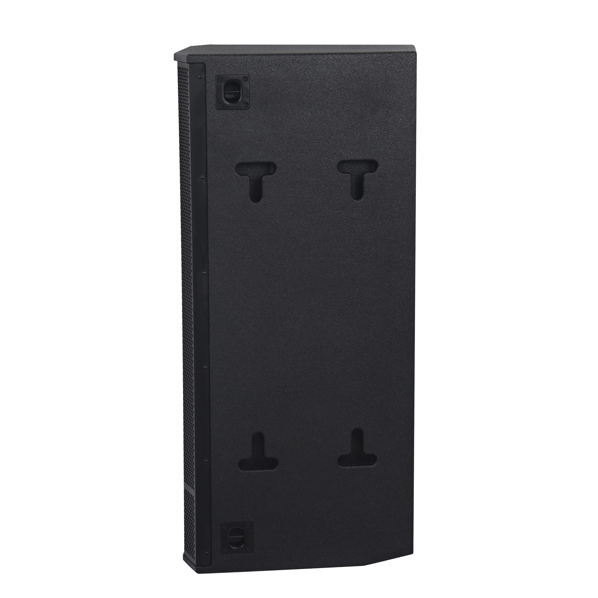 箱體由高質(zhì)量的18mm厚多層樺木夾板制作,表面采用黑色耐磨水漆處理。箱體頂部帶有金屬條提手美觀大氣,箱體為半圓面、半梯形結構,配備DSP功放,D類數(shù)字功放,內(nèi)面還采用了防塵網(wǎng)紗設計,更有效地保護驅動單元,整體外觀設計極具專業(yè)風格。