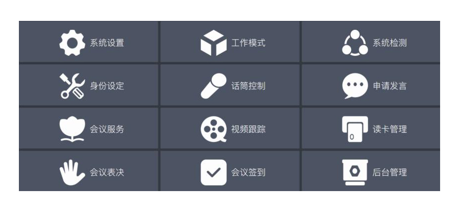 具備系統(tǒng)設(shè)置、工作模式、系統(tǒng)檢測、身份設(shè)定、單元控制、申請發(fā)言、會議服務(wù)、視頻跟蹤、讀卡管理、會議表決、會議簽到、后臺管理等12個功能模塊
