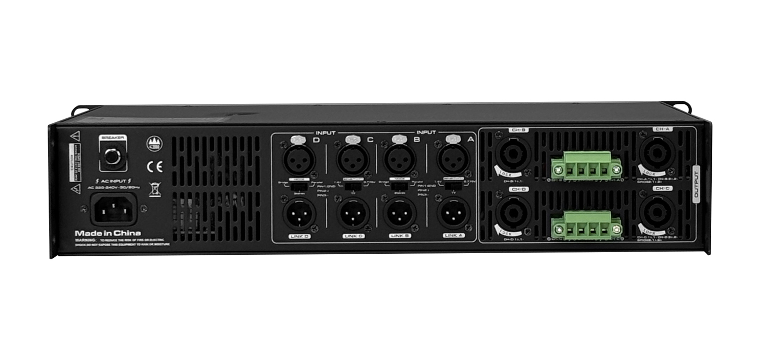 該系列兼容各種揚聲器,安裝選項多樣化,結(jié)合高品質(zhì)環(huán)牛變壓器做為動力源泉,旨在提供穩(wěn)定動力。在8Ω時兩通/四通道每通道功率提供功率由400W-1500W可選,支持環(huán)接,LED 指示燈顯示功放操作狀態(tài),易于使用。