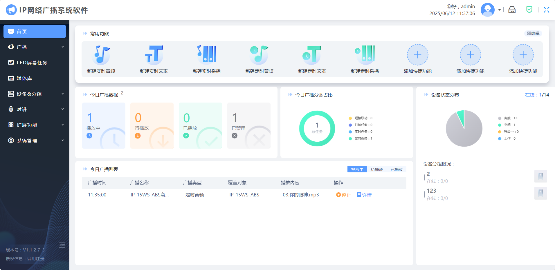 4.定時廣播:任務(wù)定時、定點自動播出,支持定時音頻/文本/采播廣播,可批量創(chuàng)建多時段定時任務(wù),支持一鍵啟用/禁用,高可控性和智慧化。