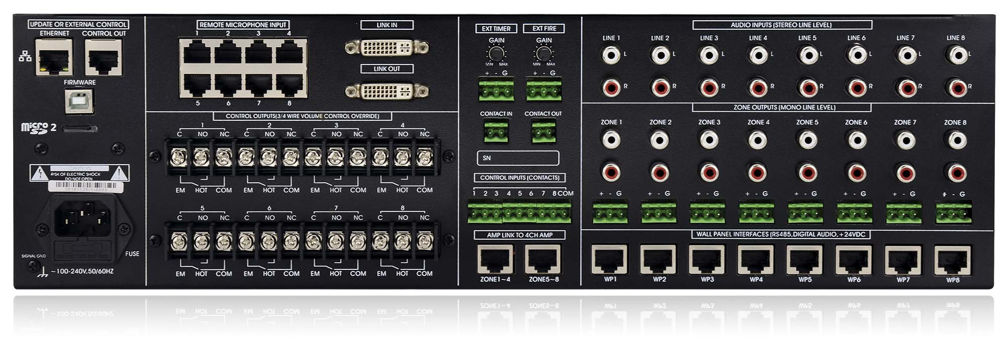 支持8路話筒工作站輸入及輸入增益,高低音均衡調(diào)節(jié)