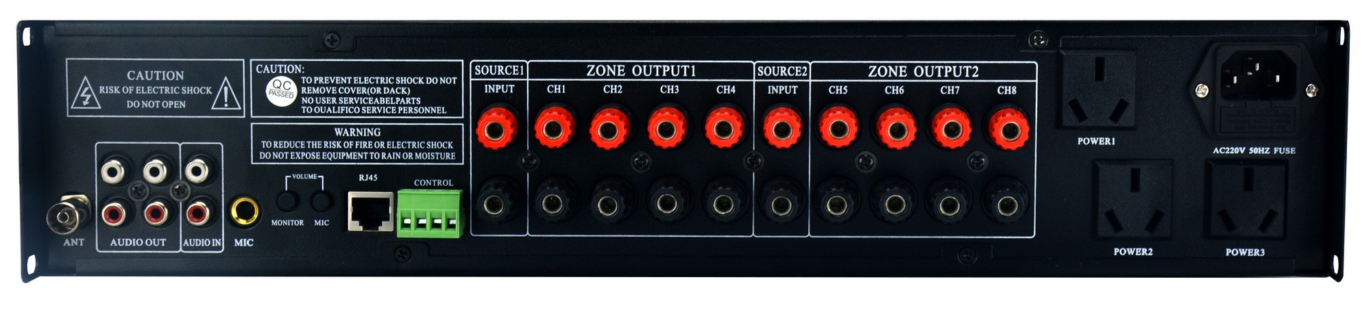 功率分區(qū) | 兩路功放輸入,八路功率分區(qū)輸出;合計(jì)最大容量3200W |
