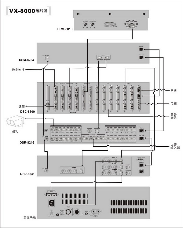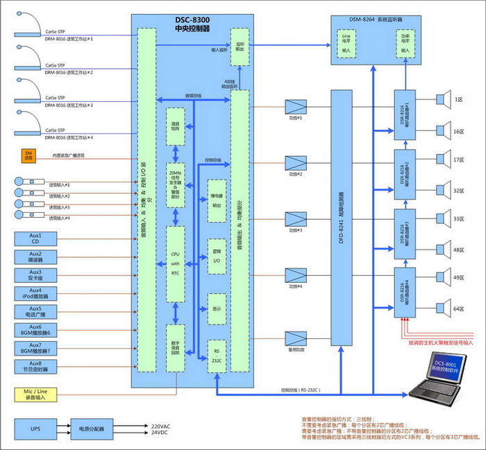 整個系統(tǒng)可以控制16種不同的輸入音源(其中包括4支遠程尋呼話筒DRM-8016)經主機4條總線音源輸出,同一時間支持四種系統(tǒng)音源播放,利用喇叭路由器DSR-8216將四種不同音源的功率動態(tài)分配到系統(tǒng)的任何分區(qū),整個系統(tǒng)可以最大支持64個分區(qū)。