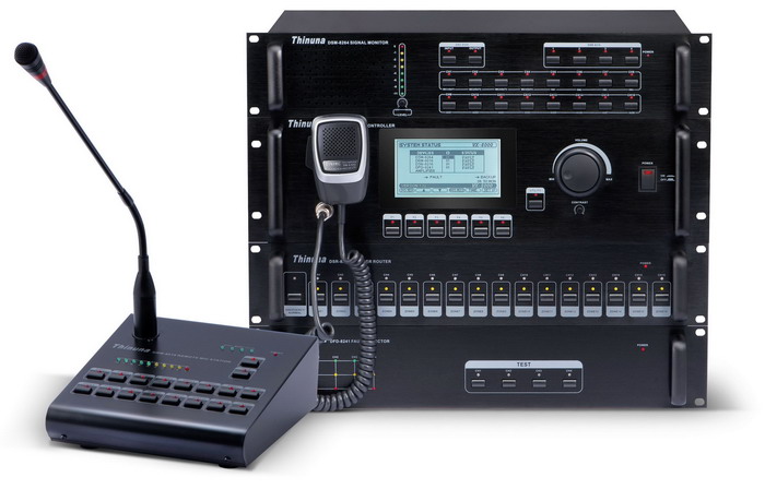中央控制器DSC-8300內置16×4輸入輸出混音矩陣切換功能,為每一個輸入提供了高低音均衡調節(jié)及增益調節(jié),為4總線輸出提供7段圖示均衡調節(jié)及增益調節(jié),同時內置了7段聲音存儲和播放芯片,可進行人工播放,遠程話筒工作站遠程控制播放及火警自動觸發(fā)播放;中央信號處理器還為系統(tǒng)所有設備通過RS-422連接進行通信,通過主機可以控制和監(jiān)測到系統(tǒng)任何一臺設備的運行狀況,保證系統(tǒng)的可靠性及安全性。