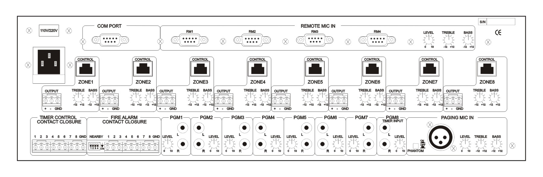 1支緊急話筒輸入,帶高音,低音,音量調節(jié),幻象電源