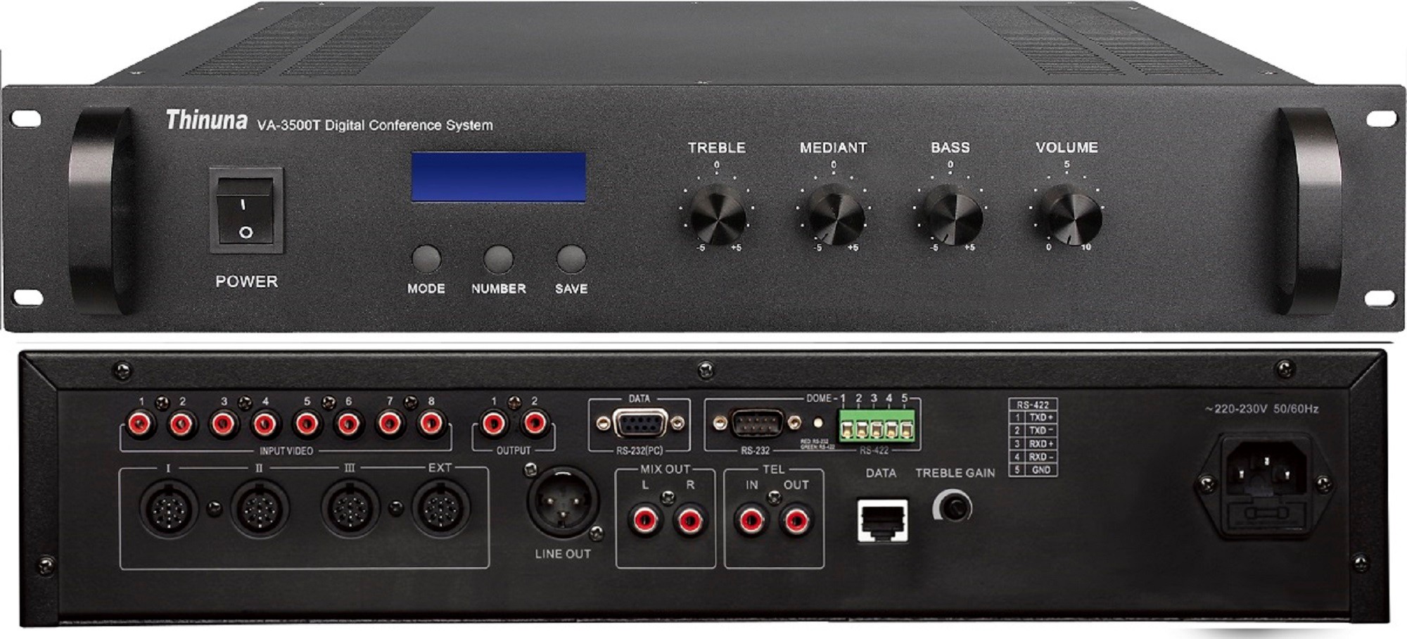 基于Thinuna Net-Stream數(shù)字通訊技術,符合IEC60914國際標準 內置高性能CPU,數(shù)字化設計,系統(tǒng)更穩(wěn)定,運算更快捷,具備四組8P-DIN話筒連接接口,可以支持15×4組=60個發(fā)言單元,增加擴展主機可以最多連接240個發(fā)言單元。