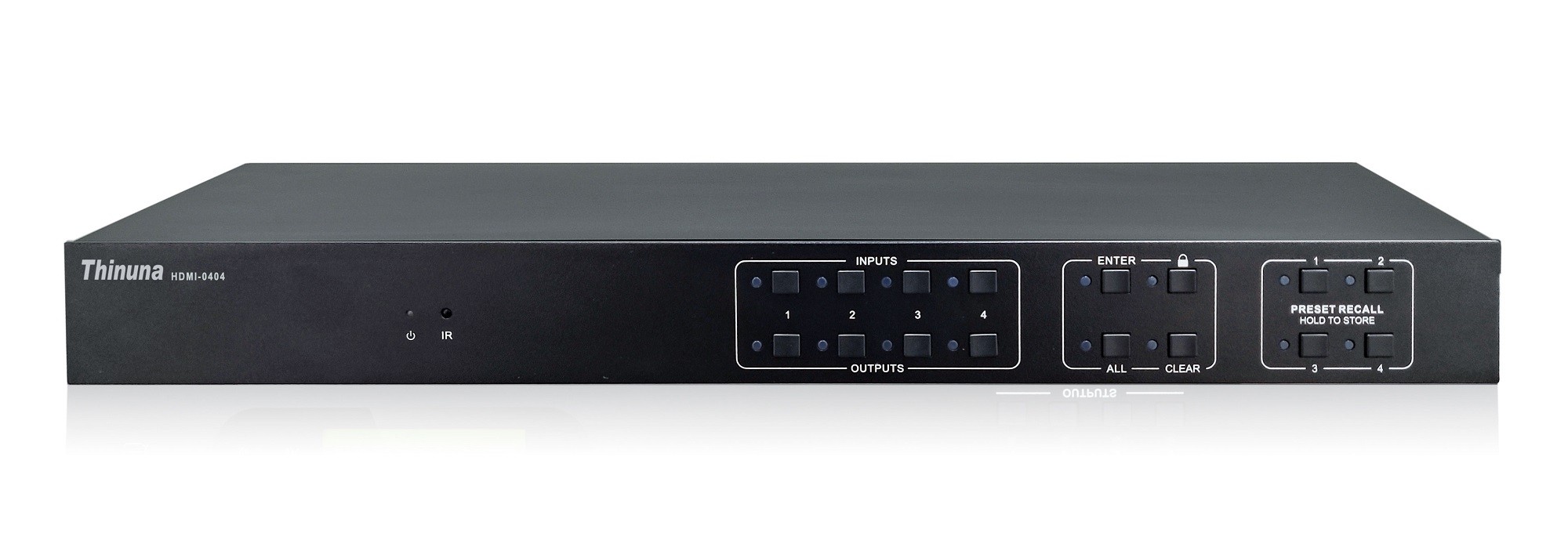 HDMI-0404是一款18G HDMI矩陣切換器,由4路HDMI輸入與4路HDMI輸出組成,形成4x4矩陣切換器。每路HDMI輸出都分別帶有1路數(shù)字同軸音頻輸出。支持4Kx2K、1080P 3D分辨率,支持HDMI 2.0標(biāo)準(zhǔn),兼容HDCP 2.2。智能化EDID管理,內(nèi)置10種EDID數(shù)據(jù)。設(shè)備控制方式靈活多樣,包括網(wǎng)口控制、串口控制、紅外控制、面板按鍵控制。