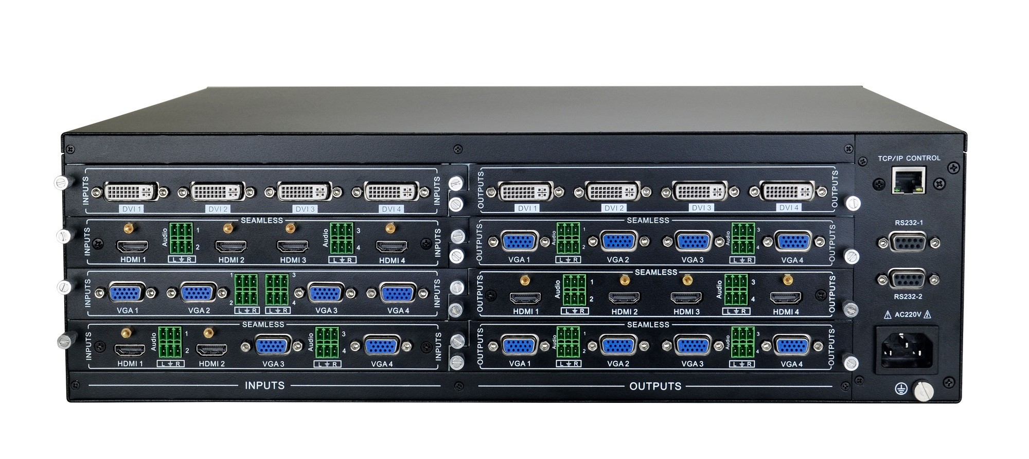 每張板卡含有4路信號接口,支持CVBS、YPbPr、VGA、DVI、HDMI、3G/HD/SD-SDI、HDBaseT、Optical等信號無縫任意輸入輸出切換傳輸;