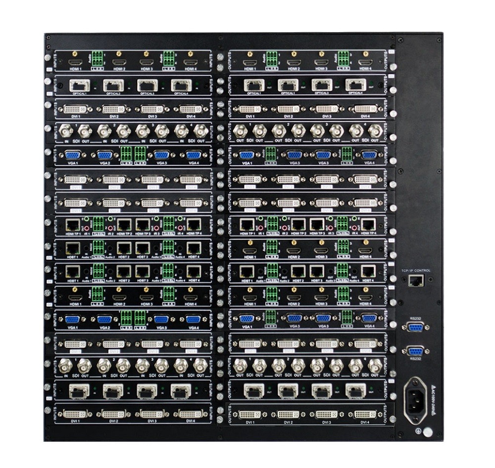 矩陣箱體配置輸入/輸出信號(hào)卡的模塊化矩陣主機(jī),最大支持64x64路的音視頻信號(hào)切換卡接口,支持熱插拔;