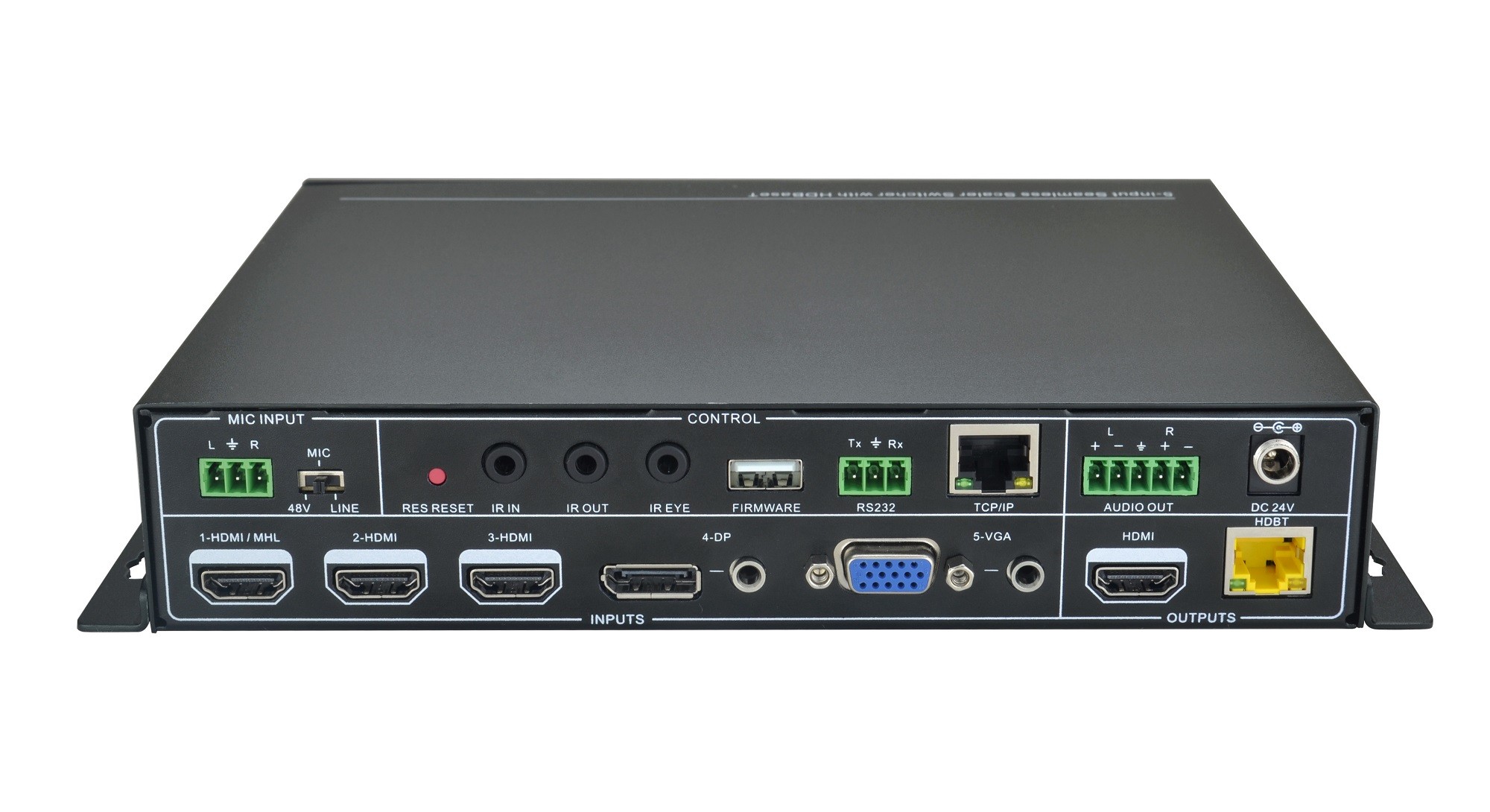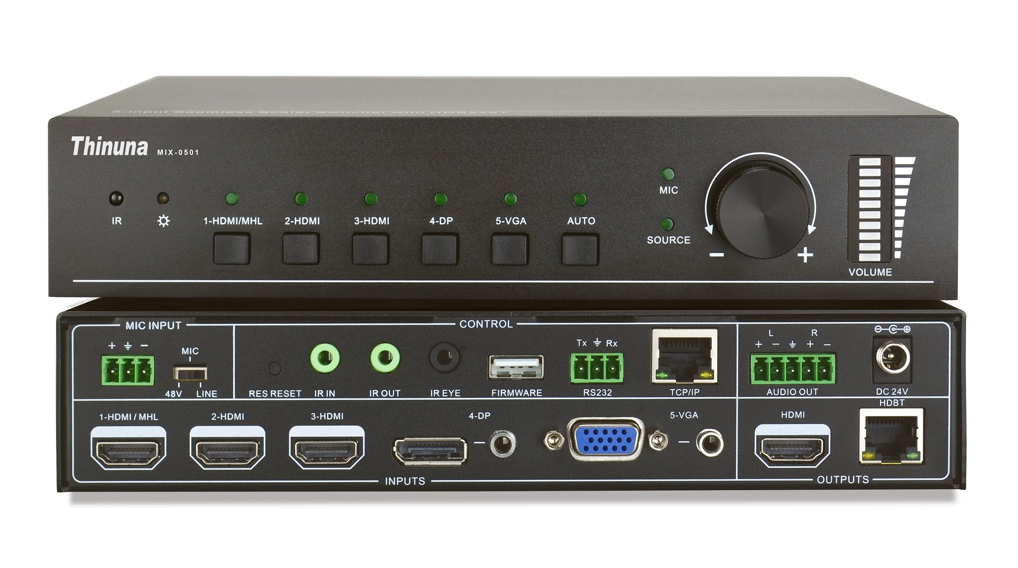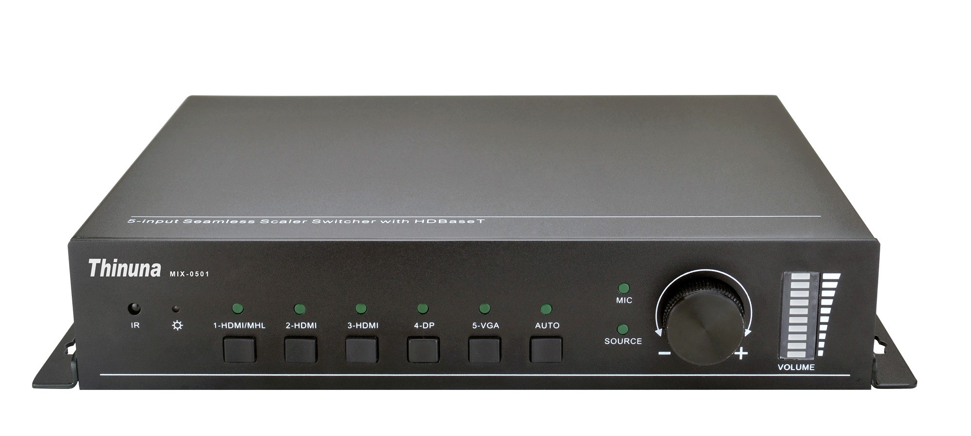 MIX-0501是一款全高清的混合倍線切換器,支持3路音頻信號(hào)輸入(DP外接音頻、VGA外接音頻、MIC音頻);5路視頻信號(hào)輸入(1-HDMI/MHL、2-HDMI、3-HDMI、4-DP、5-VGA);具有1路立體聲平衡音頻輸出;2路視頻信號(hào)輸出(HDMI & HDBaseT);以及4路控制信號(hào)(IR IN、IR OUT、IR EYE、RS232)。