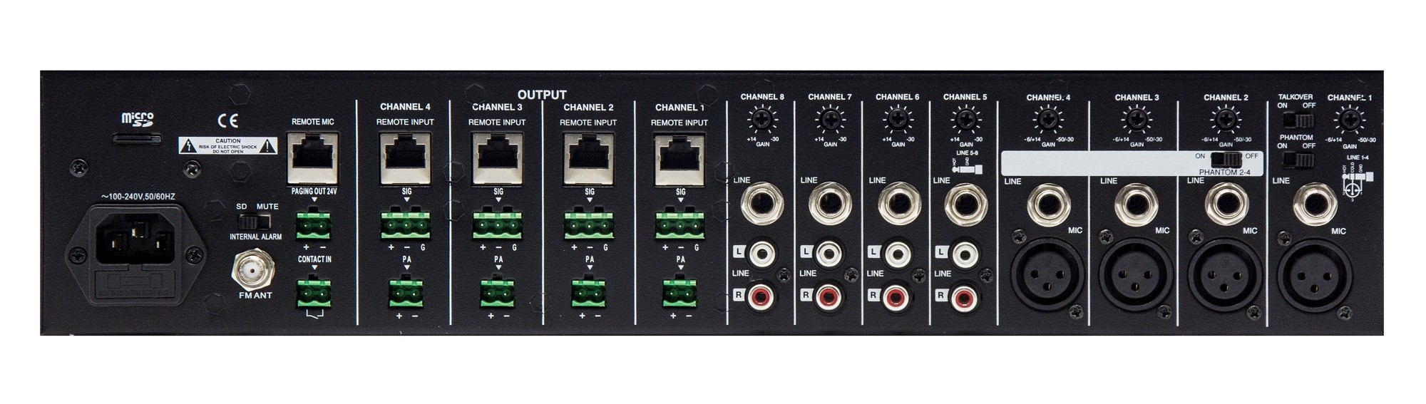 四路單聲道Mic/Line(話筒或線路) 平衡輸入帶高中低音三段均衡調(diào)節(jié)(前面板)及輸入增益調(diào)節(jié)(后面板)