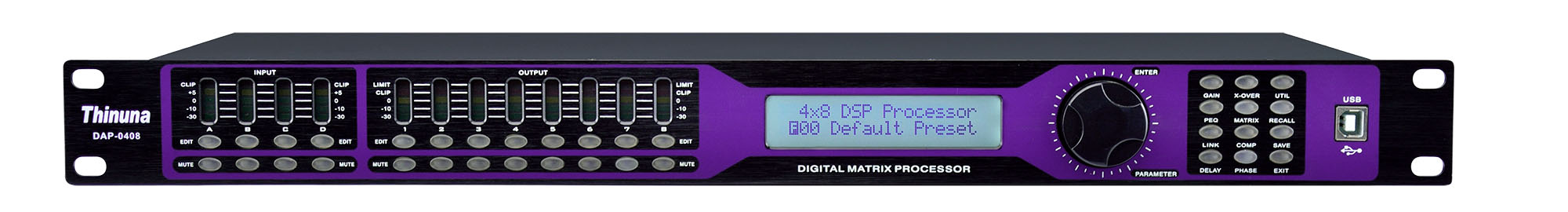 輸出處理部分包含分頻、10個(gè)參量均衡、增益、靜音、壓縮/限幅器、相位、延時(shí)、LINK等8個(gè)處理單元