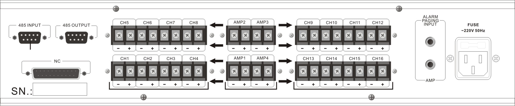 1路尋呼/報(bào)警功放輸入: 對(duì)應(yīng) 1~16區(qū);