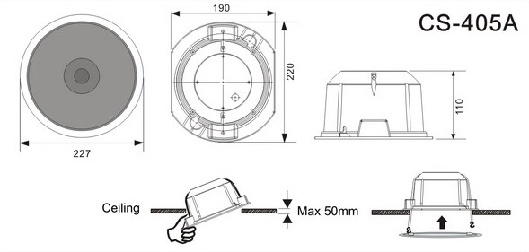 開孔尺寸: ?200 x 120H mm, 最大天花厚度: 50mm