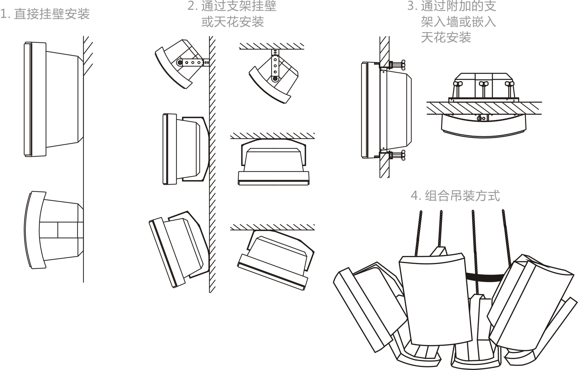 安裝 : U型安裝支架或直接掛墻安裝,可選其它安裝支架